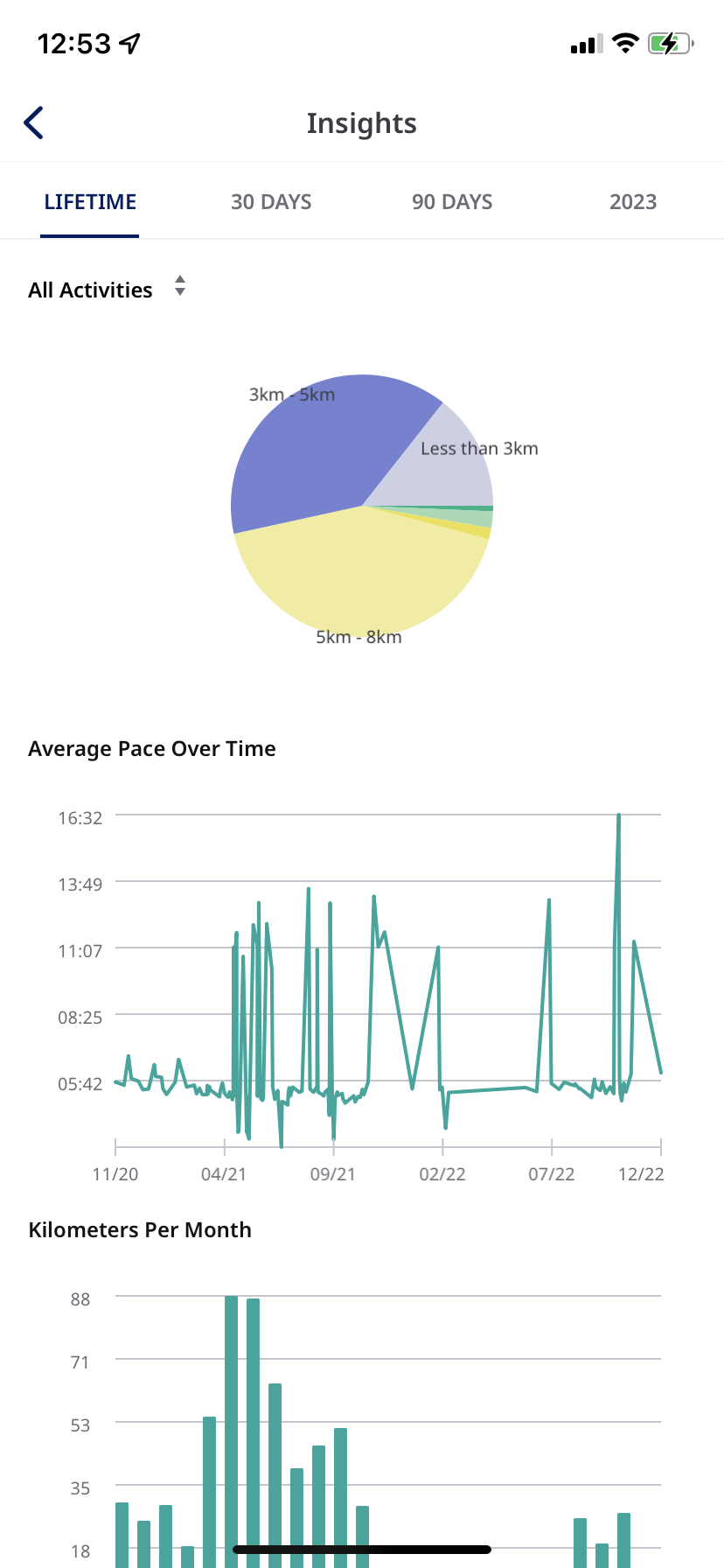 - Hier kannst du Statistiken wie dein durchschnittliches Tempo über einen bestimmten Zeitraum oder deine Kilometer pro Monat einsehen.