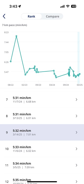 If you tap that tab, you'll be presented with two screens, where you can look at where your run Ranks compared to other runs, and then another where you can actually select another run to compare the trip to. You'll be presented with the Pace/Speed chart, and then you can swipe left to view the Elevation comparison.