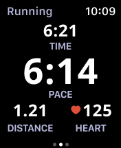Layout 1 places your GPS-tracked Distance value at the centre of the screen. This layout allows you to see the total Time of the activity, your Average or Current Pace (depending on your selection on the settings page) and your Heart Rate.