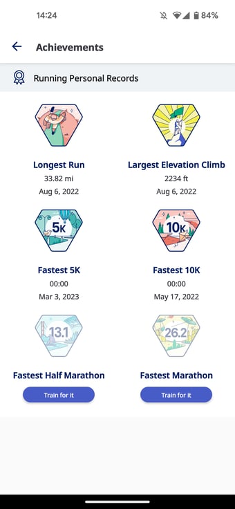Personal record race badges will unlock when you complete a 5K, 10K, half marathon, or marathon race and will update when you set new records for those races. There are also personal record badges for longest distance and highest elevation. You can click right into them to view more details for the specific activity that unlocked each badge.