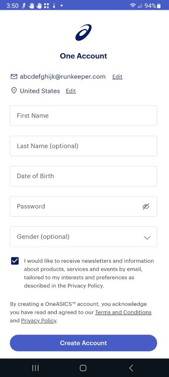 After installing the app, you will be prompted to either sign up for a new OneASICS account or log in to an existing account.