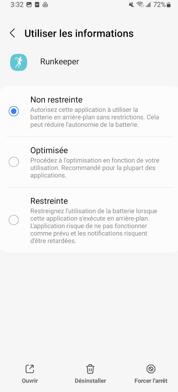 Retirez Runkeeper de la liste des applications « optimisées ».