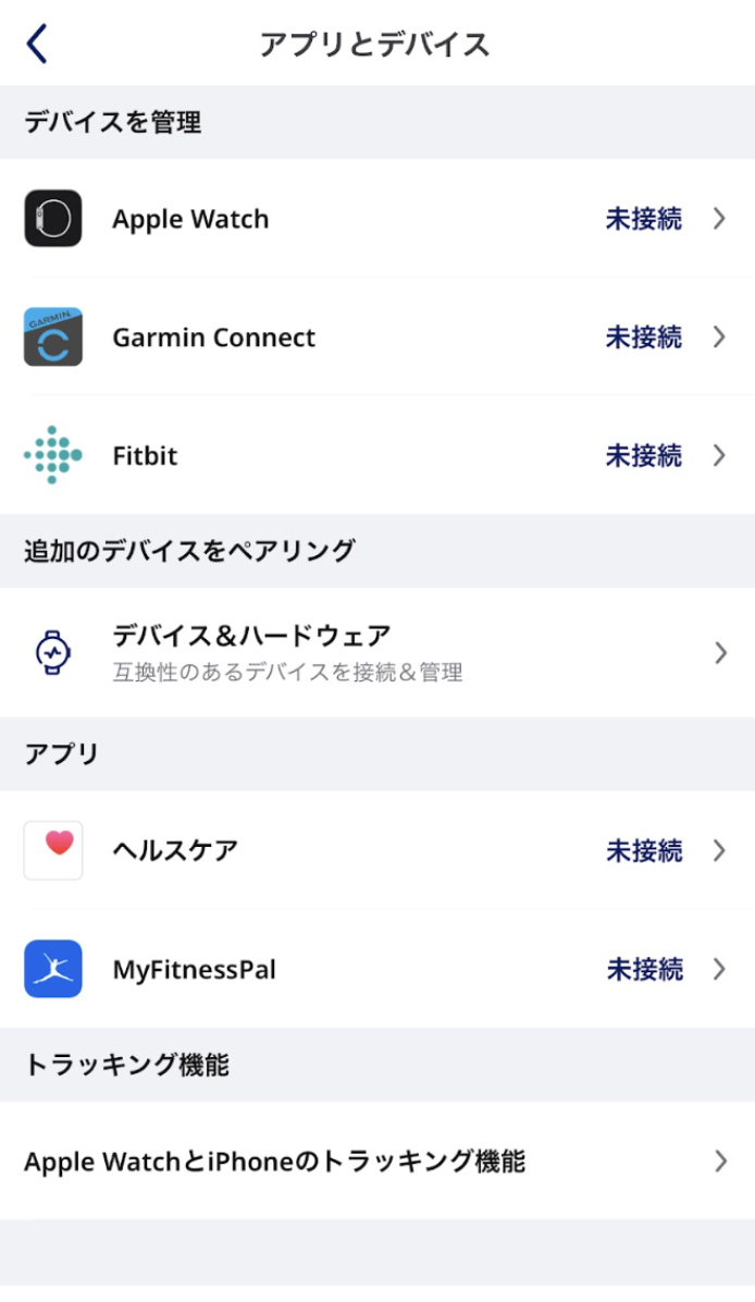 iPhoneでRunkeeperアプリを開くと、アプリとデバイスページが表示されます(ユーザータブの右上にある歯車のアイコンをタップし、設定ページから開くこともできます)。 ヘルスケアと接続します。
